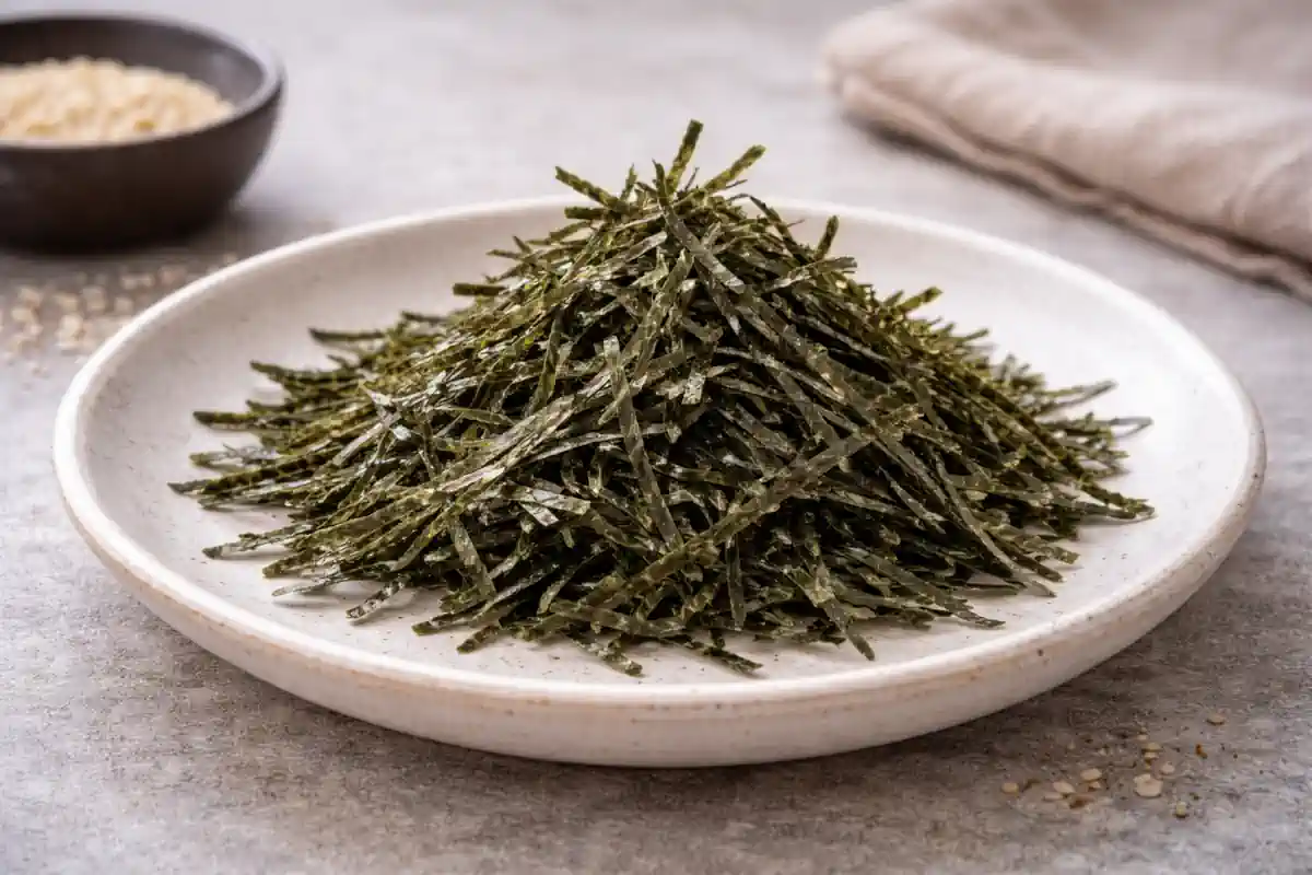 Proviene del mismo alga, pero el formato cambia según el uso. Las hojas se emplean para sushi y wraps, mientras que los copos o tiras suelen usarse como condimento o complemento en platos ya preparados.